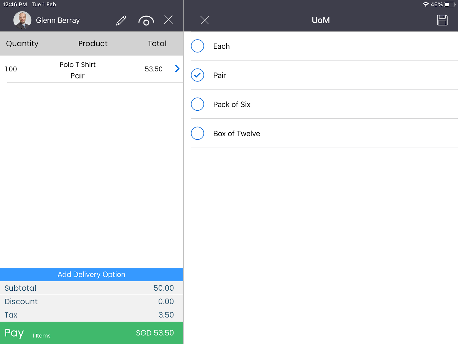 The final step is to collect the payment for the sale made. You need to tap the green "Pay" button on the transaction screen to bring up the payments window. Select a Payment Mode on the screen from among the payment options available to process the payment.
