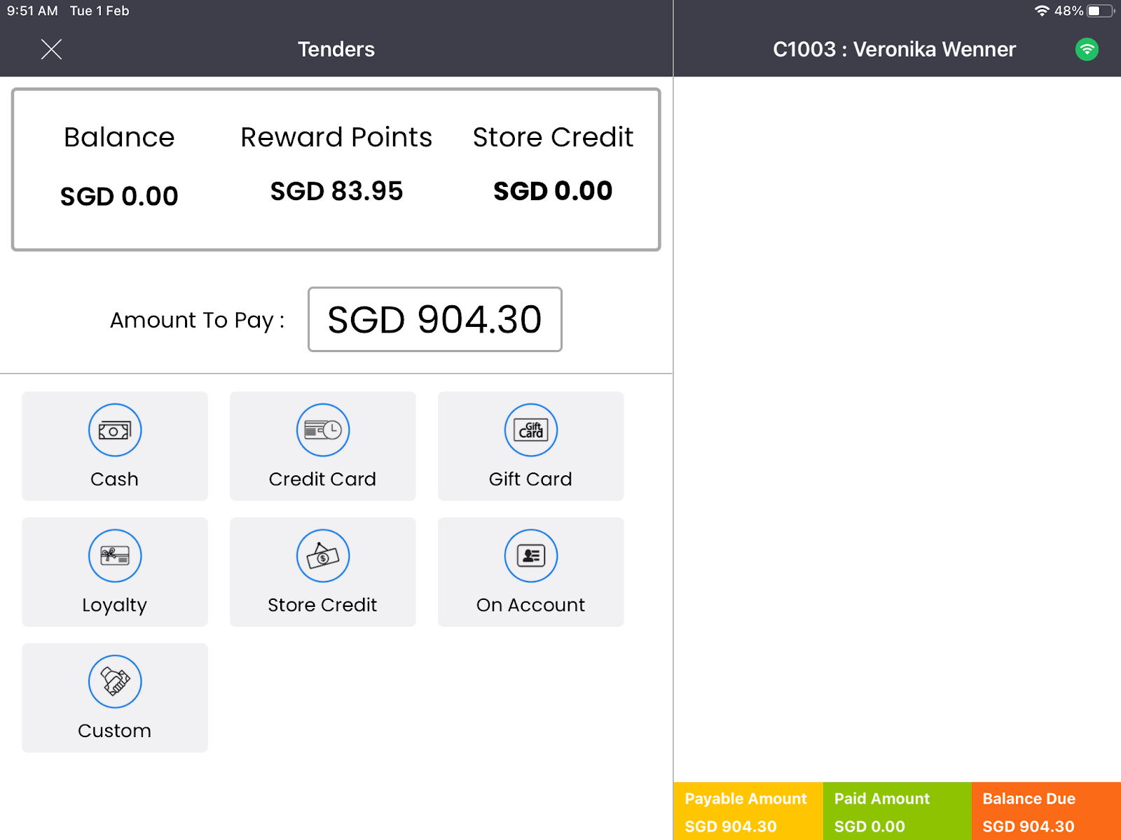 To add a customer searched above, you can either tap on the customer’s name or pick a customer name from the customer list screen. This will add the customer to your sale. You'll see his name appear above the line products in the top right corner.
