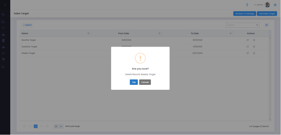 Click on the symbol to delete a Sales Target record from the master data. You should see a confirmation dialog box asking you to confirm the deletion. Click Yes on the delete confirmation dialog box to delete the sales target record.