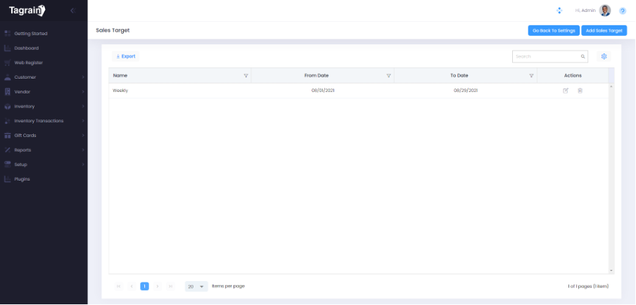 Go to Home > Setup > Store Management > Sales Target. This will bring up the “Sales Target List View” screen. All the existing Sales Target will be listed here on this screen.