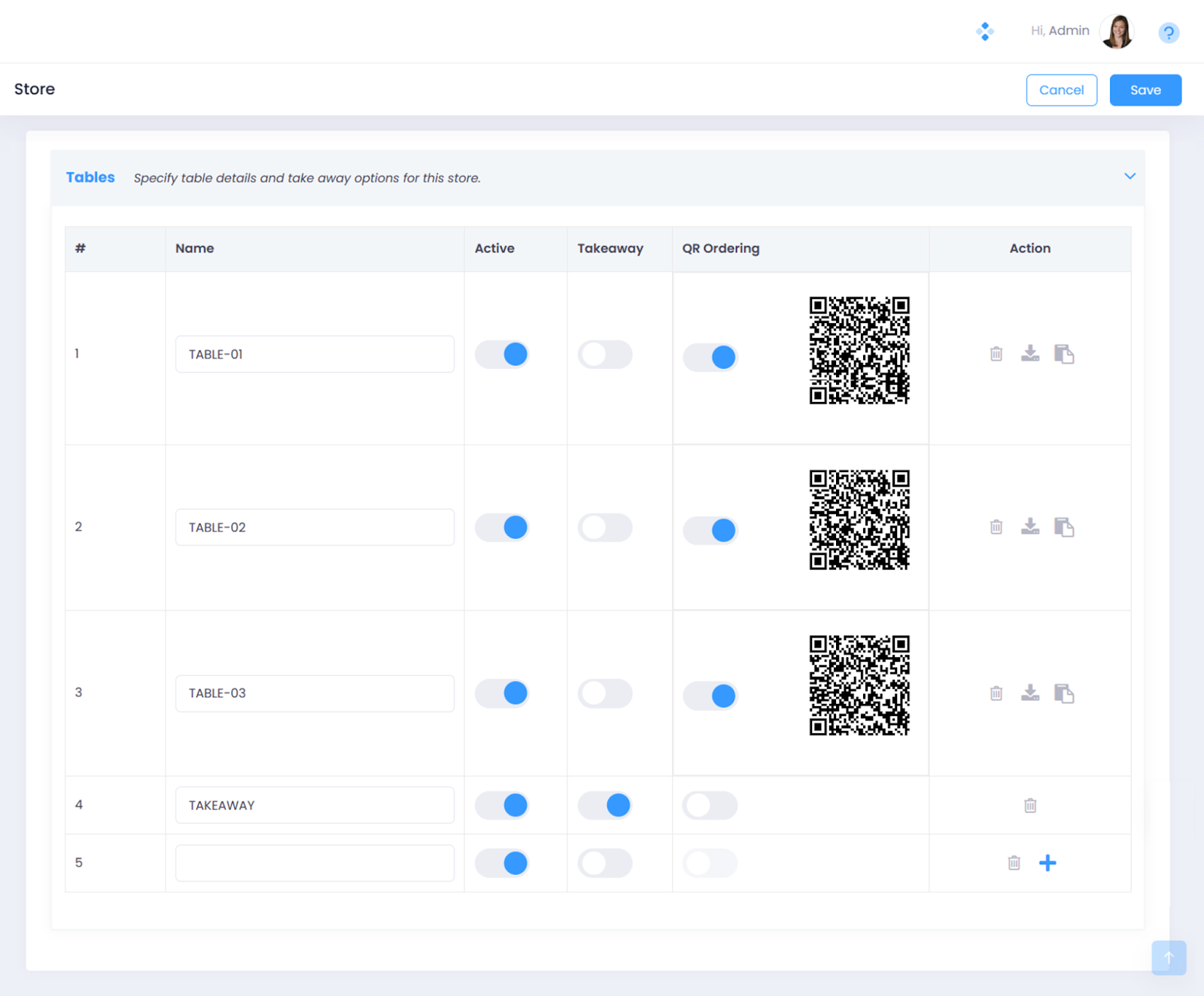 Click the download button under the Action column to download the QR Code. Once downloaded you can print and paste this QR Code on the Ordering Card and place it on the corresponding table.