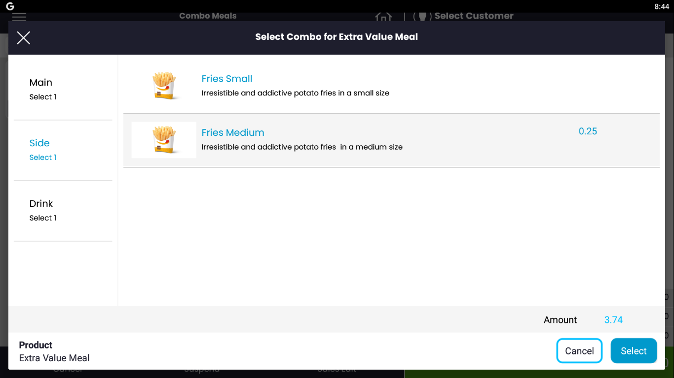 Step 3. Tap the Side Dish sub menu to select a Side Dish. For the purpose of this article, we have selected 1 quantity of “Fries Medium”.