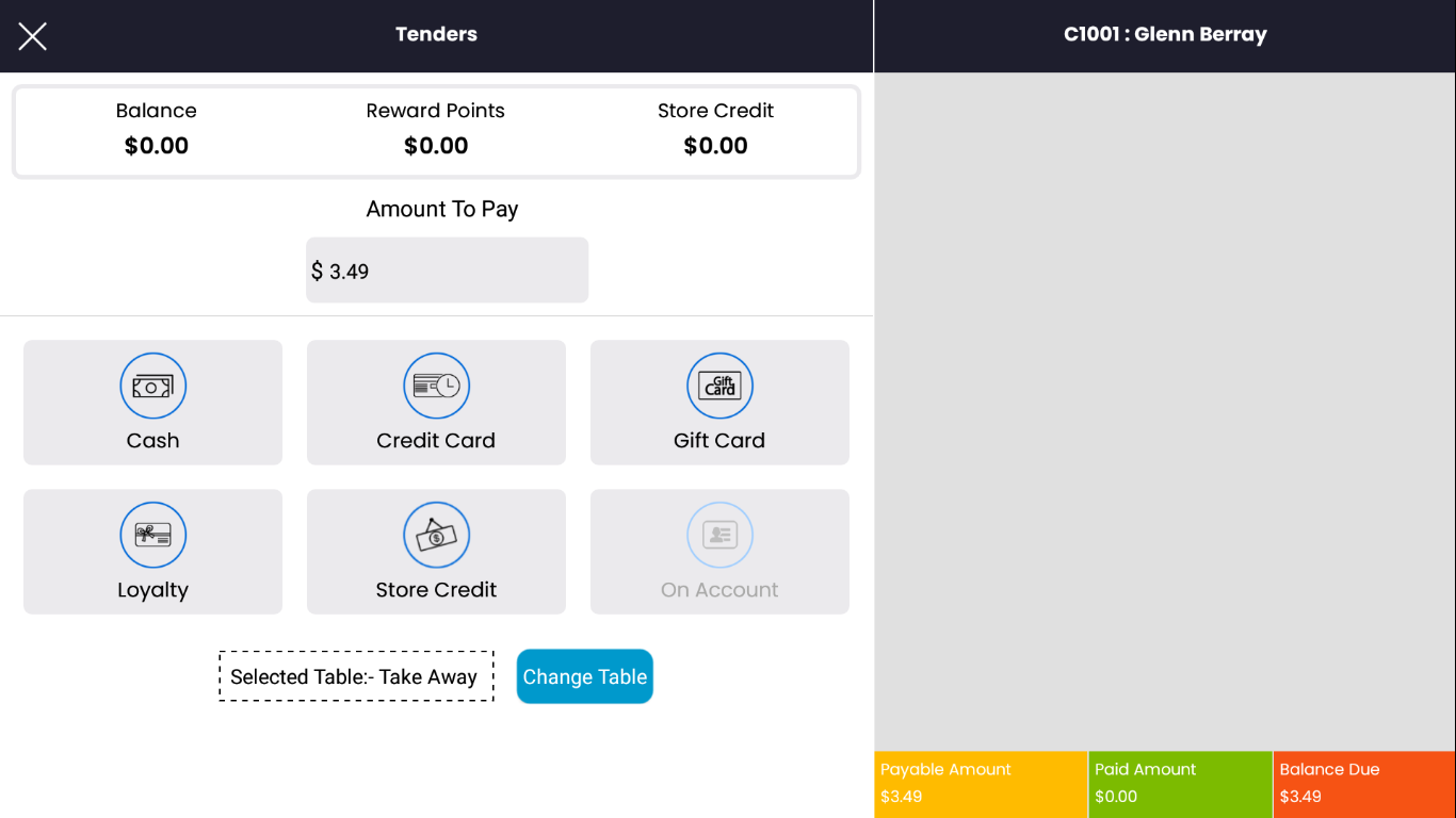 Step 5. Click the “Pay” button to proceed to the “Select Table” screen. This screen will display the table number of each table along with the “Take Away” table. Depending upon the type of order - dine in or take away, you must select a Table Type.