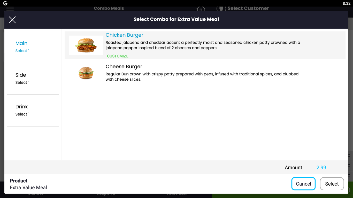Step 2. Tap on the Extra Value Meal to open the Extra Value Meal Menu. Select the Main Dish. For the purpose of this article, we have selected the “Chicken Burger” without any modifiers. The main Dish can be modified by clicking the “Customize” hyperlink.