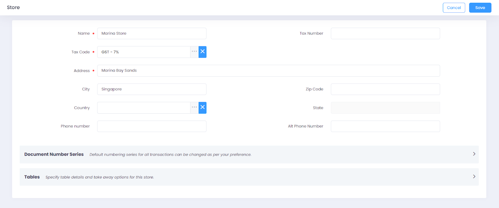 Click on Add Store to open the Add New Store screen and fill in the details. Tax Code is automatically picked up and is based on the country where your store is located.