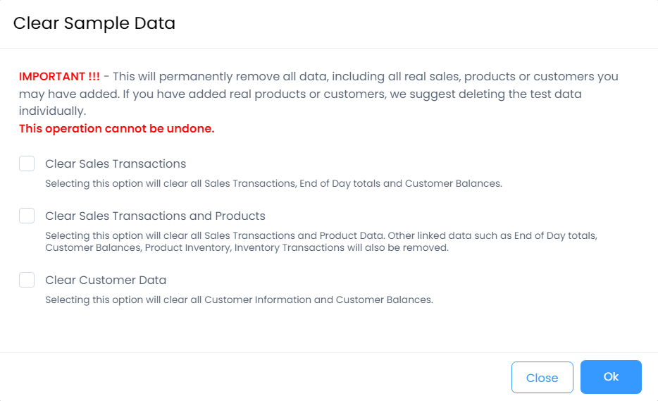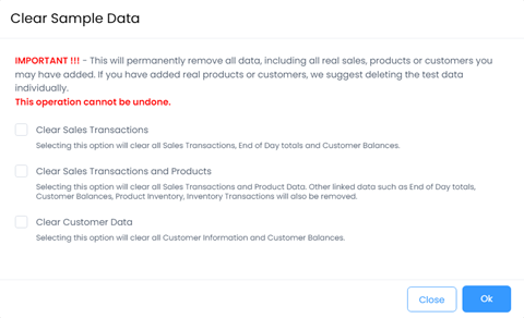 This section helps you set up your Store(s) and POS(s) in the shortest possible time. Clicking on the I’m ready button opens the Clear Sample Data pop up.