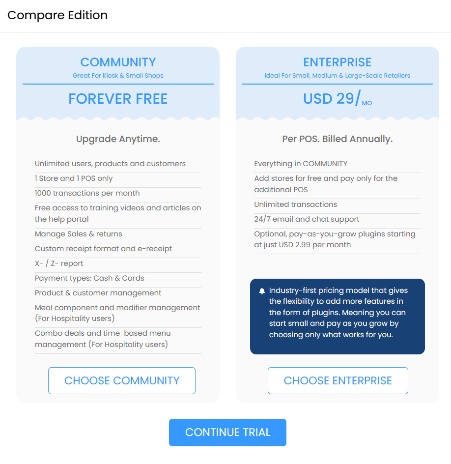 Now that you have set up your trial account, you are ready for the next step to set up your business. Although you have signed up for a trial account, you have the option to continue using the same account OR upgrade it to either COMMUNITY or ENTERPRISE edition.