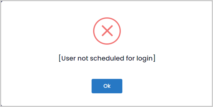 You can flip the switch Block Login Beyond Shift Time to restrict a user from logging in to the application. In our illustration, if Tony Stark attempts to log in to the application before 3:00 PM or after 8:00 PM, he should see the below pop up.