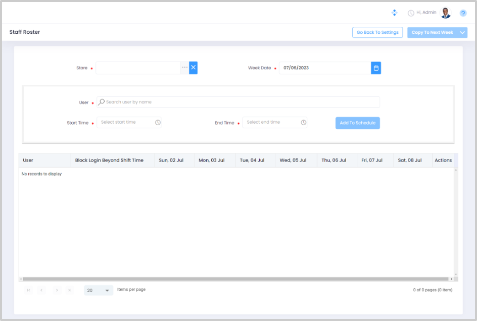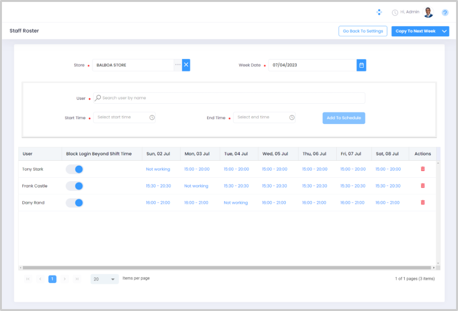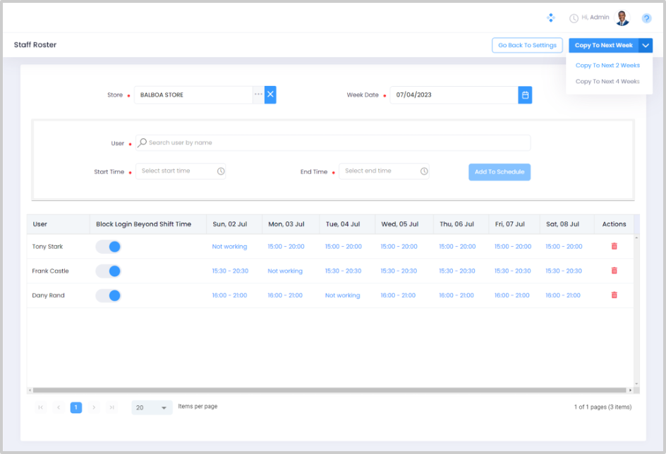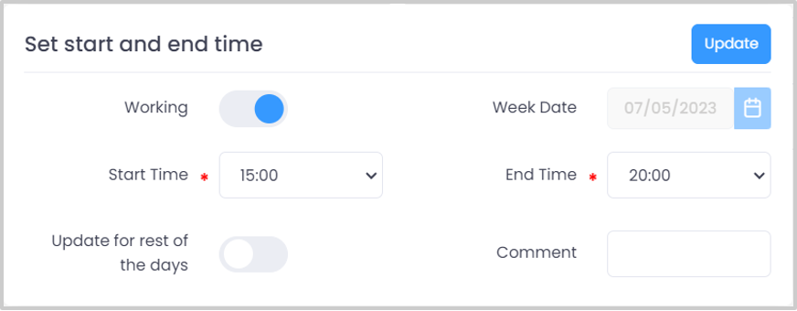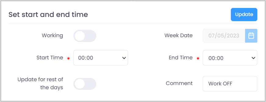 Be careful when you flip the Update for the rest of the days, switch ON to update the Start Time and End Time or schedule work off for multiple days remaining in the week. What this does is that it will create an exact replica of the current roster for the subsequent week(s).
