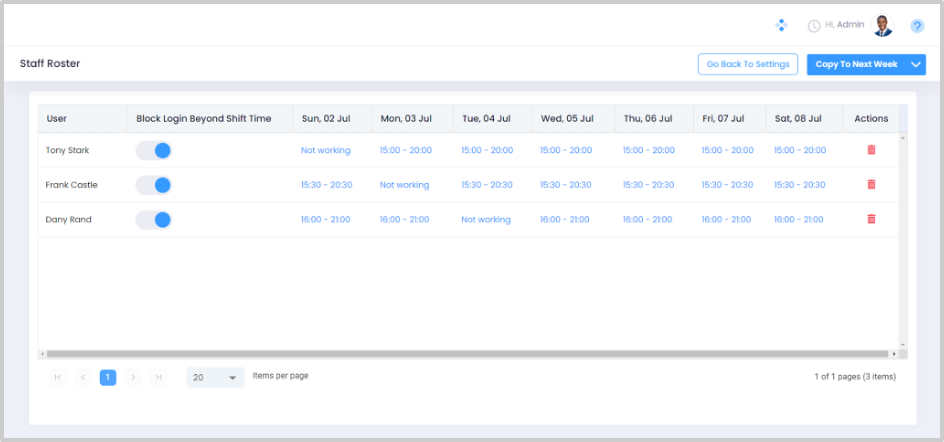 Rosters are generally defined for the entire week. However, Tagrain not only allows you to define the Staff Roster for the entire week but also carry it forward to the subsequent week(s) by clicking the Copy To Next 2 Weeks button.