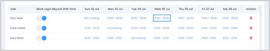 The screenshot above displays the Work Hours for Tony Stark, Frank Castle, and Dany Rand in a grid format. The grid displays the User Name, along with the date column that displays the Start Time and the End Time for that particular day.