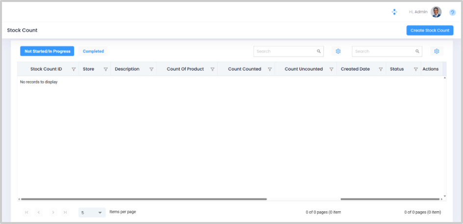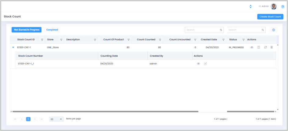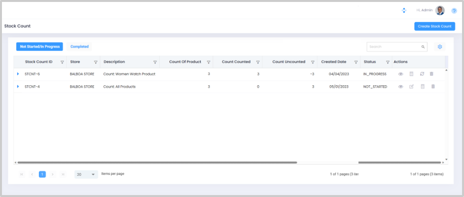 Step 1. Navigate to Home > Inventory > Stock Count to open the Stock Count List View Screen. All the Stock Counts - In Progress and Completed are listed on this screen.