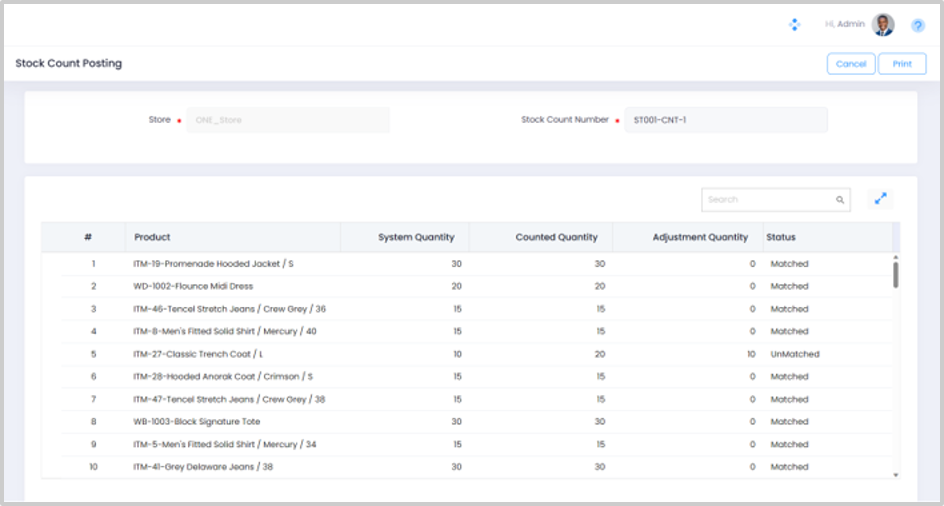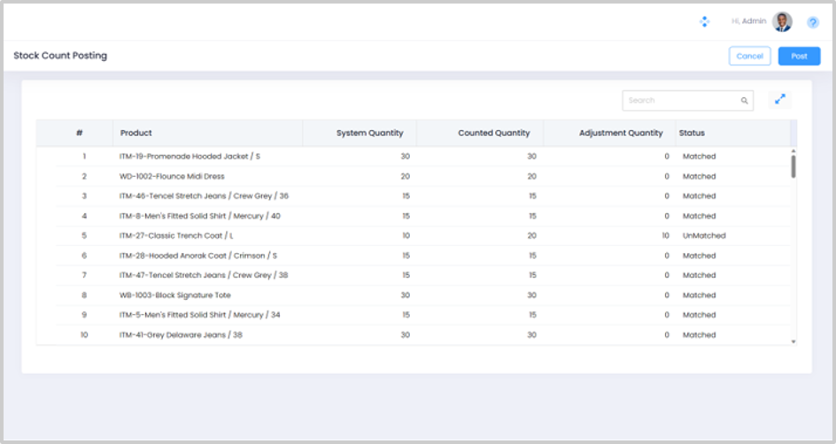 The Stock Count Posting screen displays the Product Code and Description, the System Quantity, the Counted Quantity, and the Adjustment Quantity. If the counted quantity is the same as system quantity, the status will change to Matched and in case the counted quantity is different from the system quantity, the status will change to Unmatched.