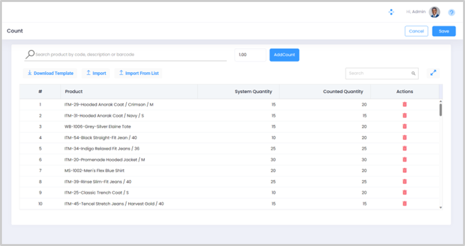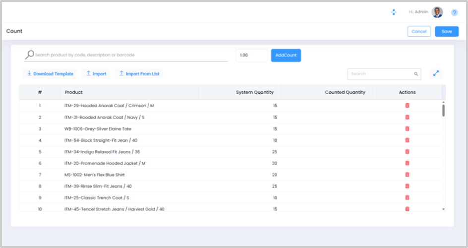 Alternatively, you can scroll down the product list to locate the desired product and enter the counted quantity in the Counted Quantity column. You can make use of the import template to import the inventory count.