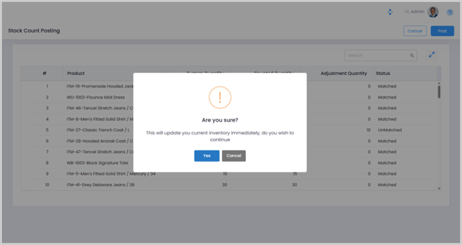 Step 12. Click the Post button. You will see a notification pop up asking you to confirm if you would like to update the current inventory. (As shown in the Screenshot below)