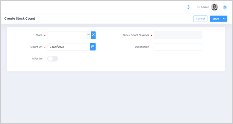 The various fields in the Create Stock Count Screen are explained below. The mandatory fields such as Store, Stock Count Number, and Count On are marked with an (*) asterisk mark.