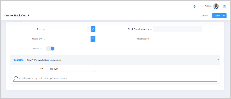 Step 7. Flip the Is Partial switch ON only if you want to perform stock counting for some of the products, else keep it OFF. Switching the Is Partial switch ON will restrict your stock count to some products.