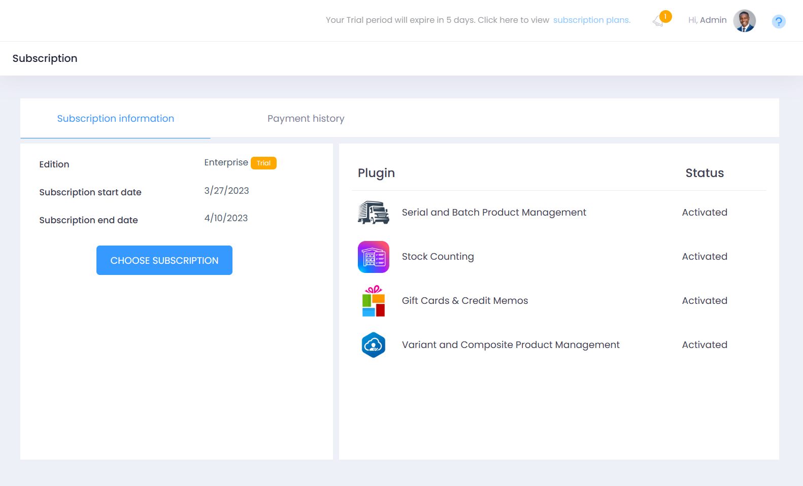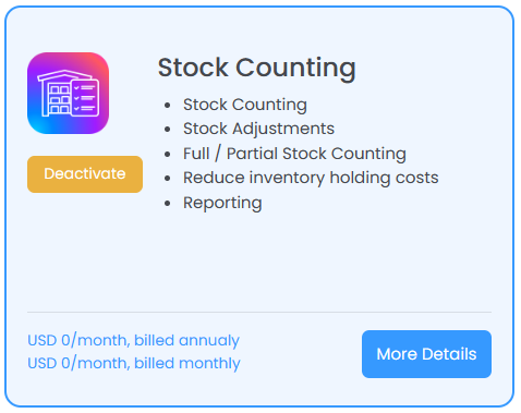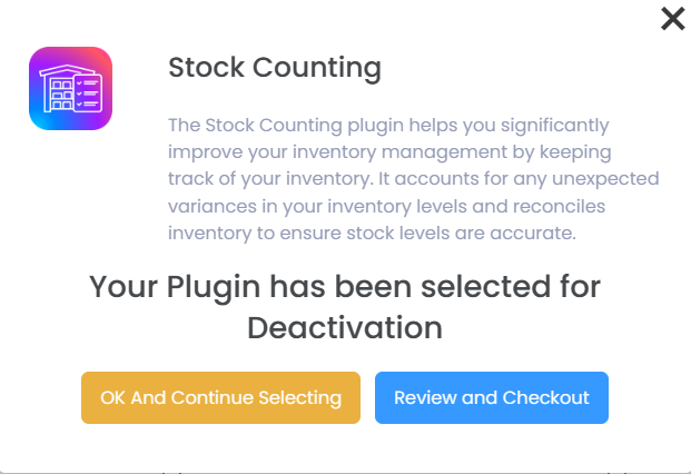 You can deactivate the Stock Counting Plugin from the Purchase Subscription page. You can approach this page via the Plugins Section or the Manage Accounts Section.
