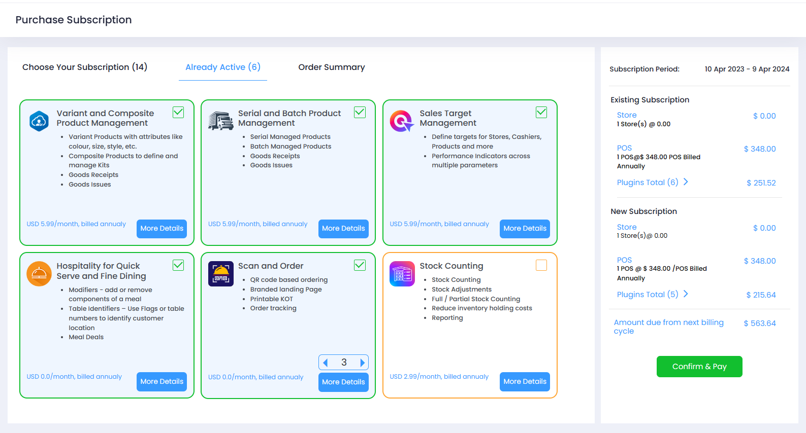 Step 4. Navigate to the Already Active section on the Purchase Subscription page. You should see the Stock Counting Plugin un-ticked / de-selected.