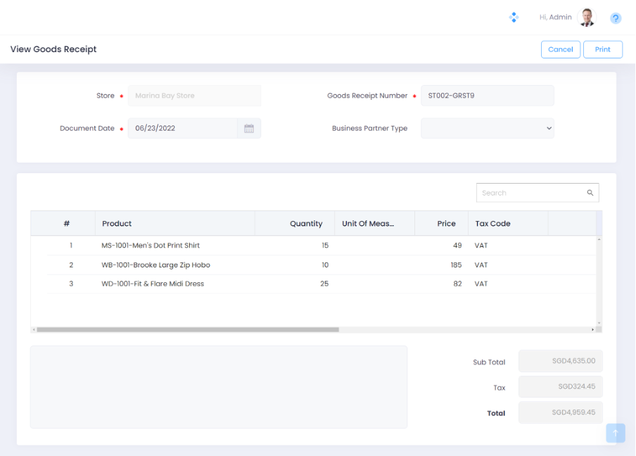 Further clicking on the Eye symbol for that Goods Receipt opens the View Goods Receipts Screen.