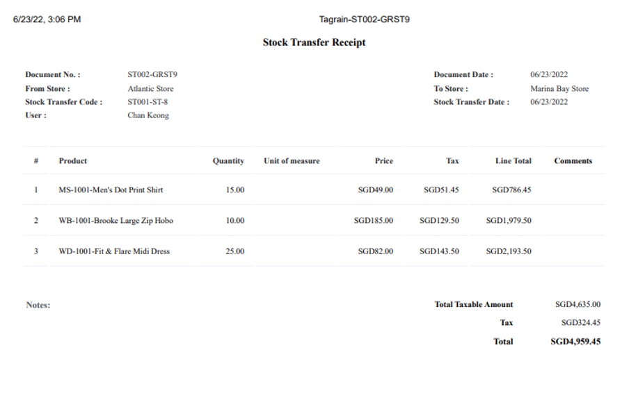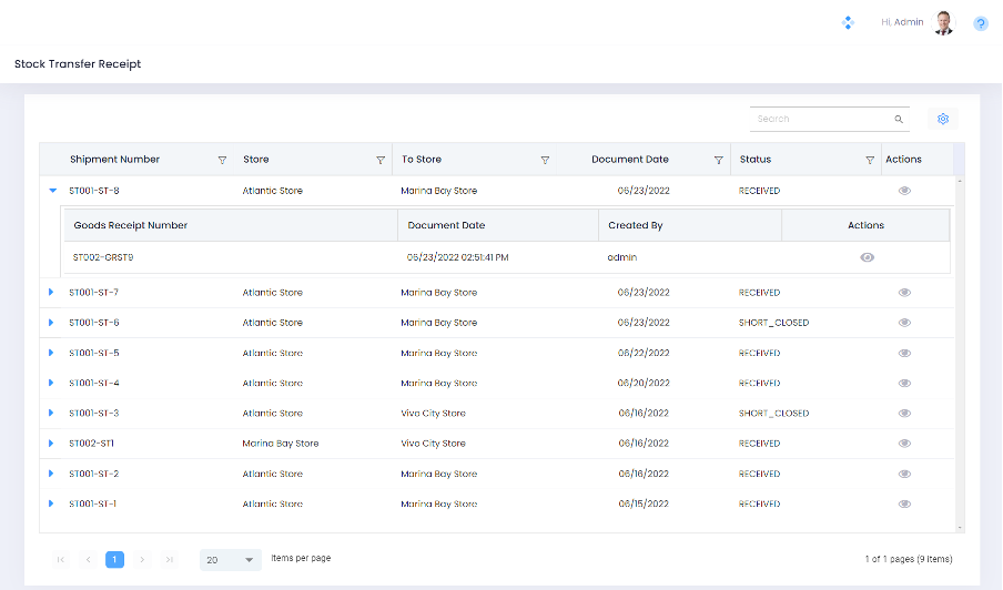 We raised a Stock Transfer Shipment request for these products MS-1001 - Men's Dot Print Shirt, WB-1001 - Brook Large Zip Hobo, and WD-1001 - Fit & Flare Midi Dress with 15, 10, and 25 quantities respectively. The receipts for this Stock Transfer Shipment can be seen under the Stock Transfer Receipt List View Screen. See: Stock Transfer Shipment