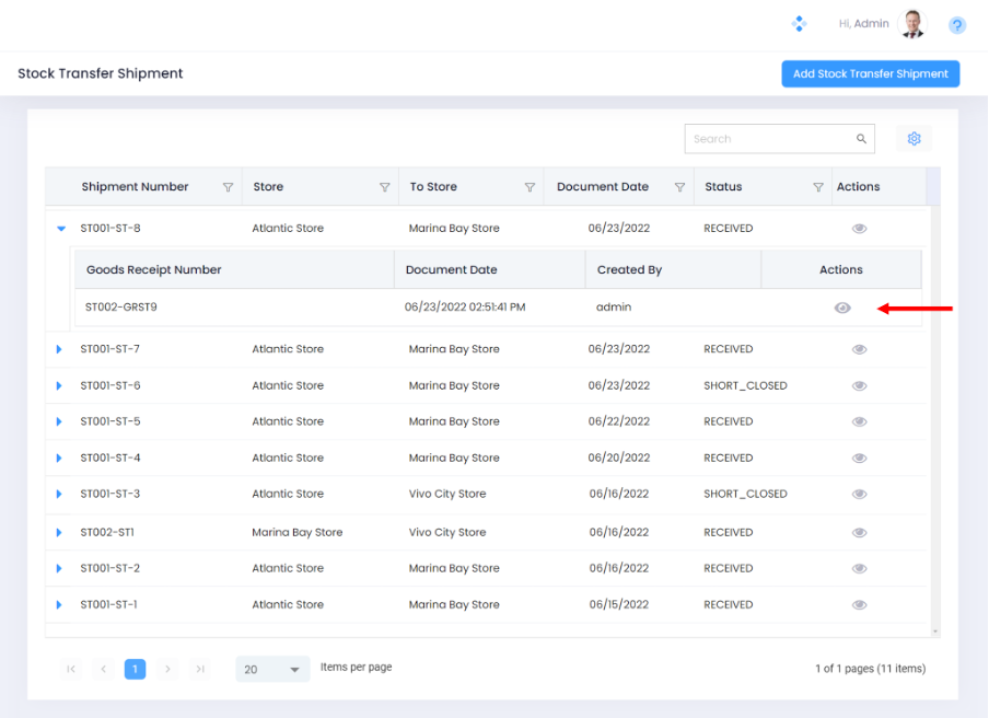 Clicking on the Eye symbol on the shipment row displays the Stock Transfer Shipment document. This document lists all the products that were sent in the shipment. However, the document will NOT detail the status of individual products – whether they have been fully received or partially received.