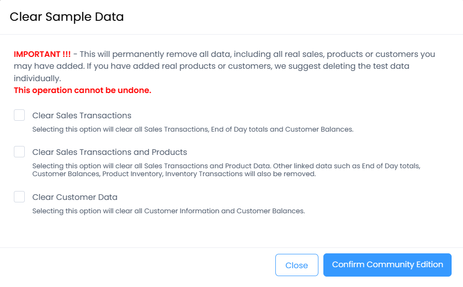 Step 5. Click the Next button to proceed to the Clear Sample Data disclaimer screen. This screen gives you the option to clear your Sale Transactions, your Products, and your Customer Data.