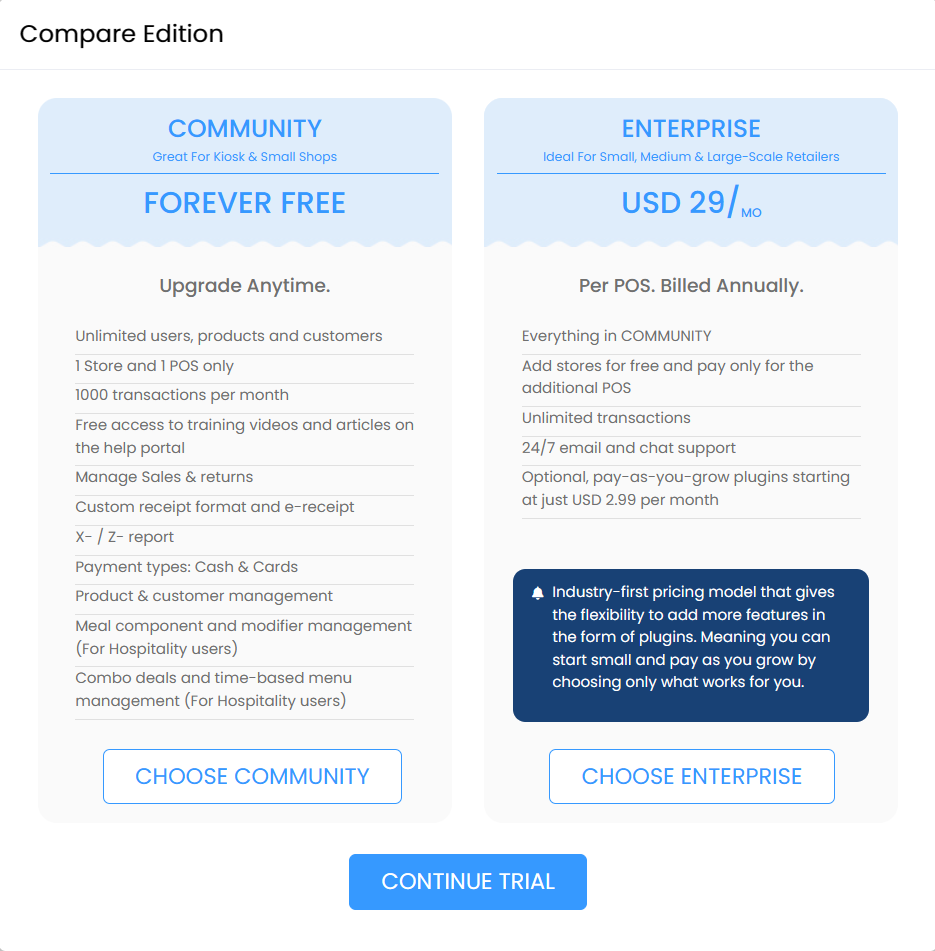 Once you have enjoyed and evaluated the trial version of Tagrain, you can switch to either Tagrain COMMUNITY or Tagrain ENTERPRISE. See: Subscribe To Tagrain. There is a subtle difference between the two editions. COMMUNITY Edition being lighter is best suited for single STORE single POS retailers, whereas ENTERPRISE edition offers multi store support and other important features required for larger operations. Both editions come in two payment options – Monthly Payment Plan OR on an Annual Payment Plan. There is a significant difference between the two when it comes to pricing. See: Tagrain Pricing.