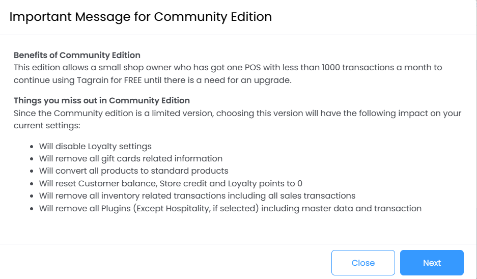 Step 4. Click on the “CHOOSE COMMUNITY” button to switch from Tagrain TRIAL to Tagrain COMMUNITY. You will get a pop up pointing out the benefits of the Community Edition and the things that you miss out in the Community Edition.