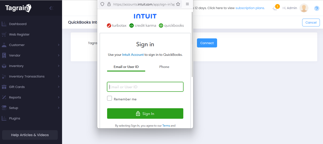 Click the Connect button, it will open the QuickBooks Online Account Login page to allow access to Tagrain.