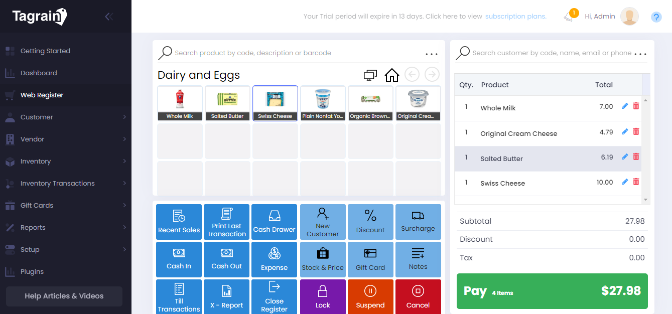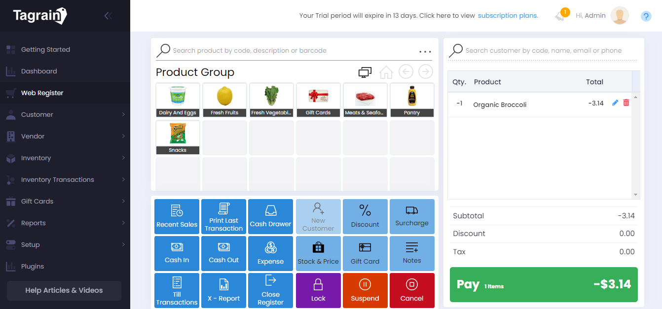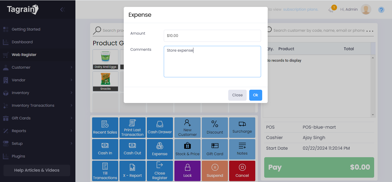 Let’s book an Expense in Tagrain at Web Register and then close the register.