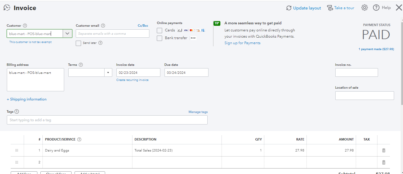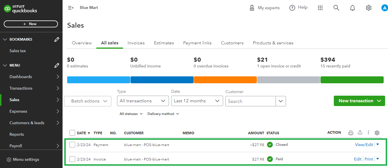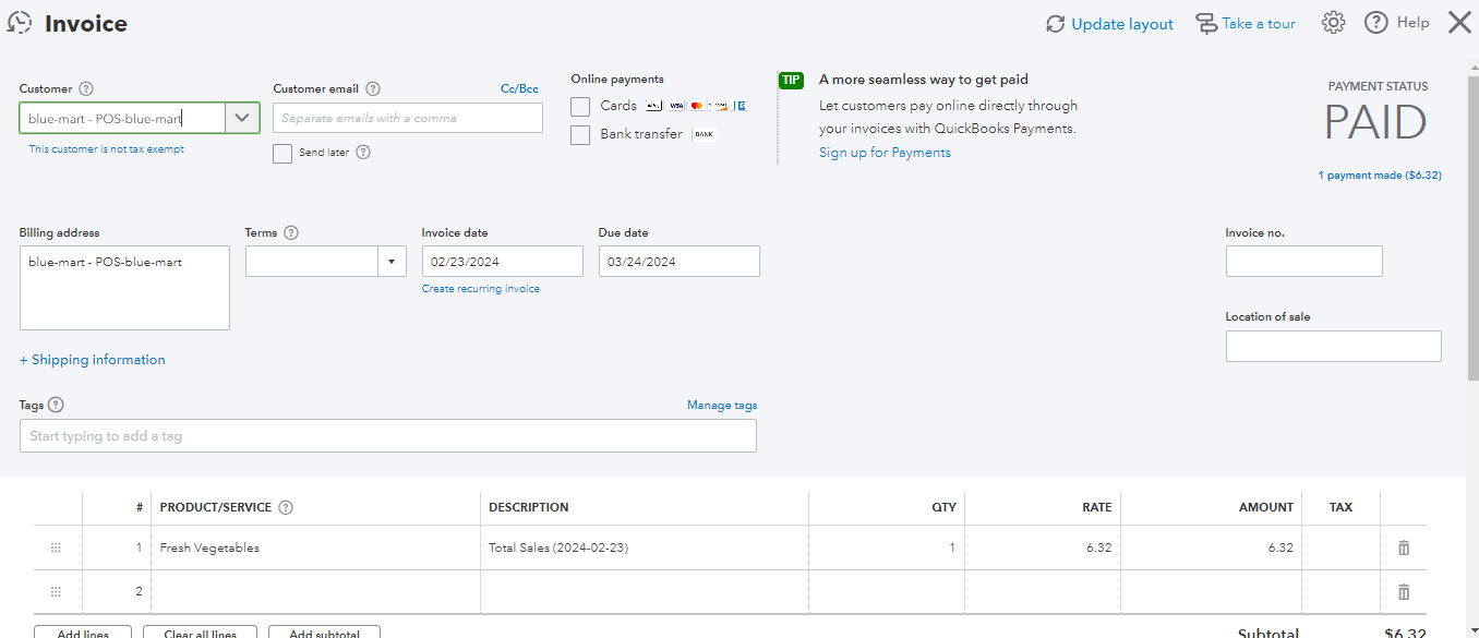 You can go to Sales > All Sales in your QuickBooks Online Account to see the posted data from Tagarain.