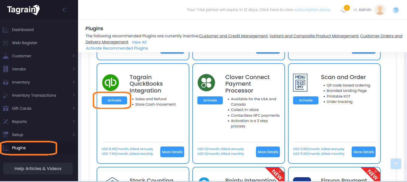 Go to Tagrain > Plugins. Click the Activate button on the Tagrain QuickBooks Online Integration plugin tile. This will select the plugin for activation.