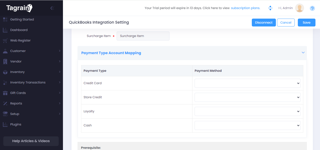 In this section, the user must map the payment types on Tagrain to different payment methods defined in QuickBooks Online.