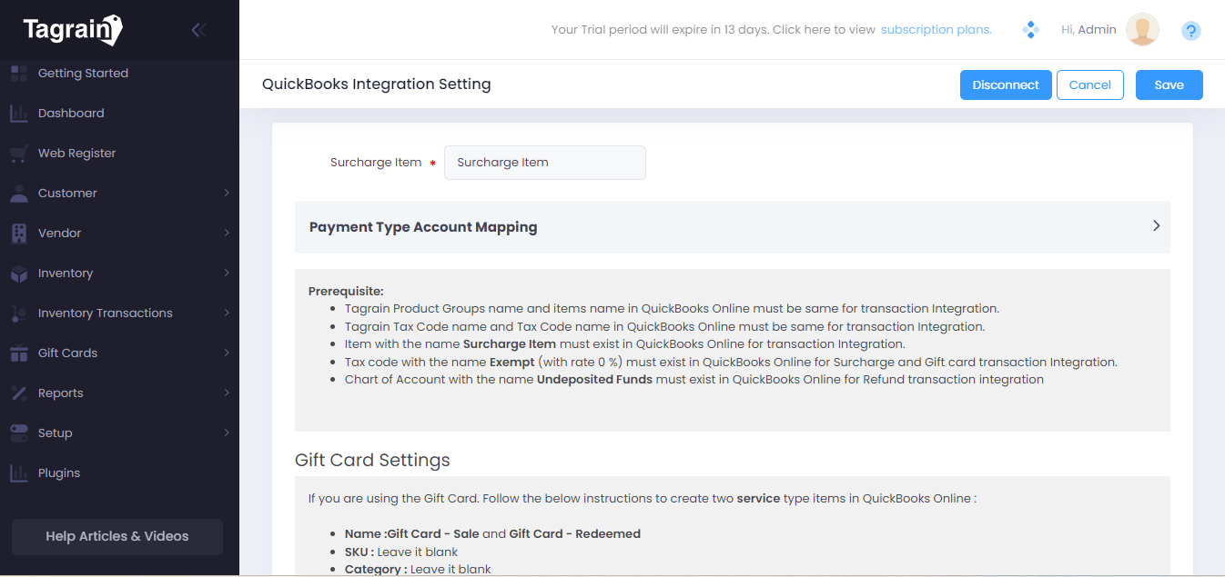 Item with the name Surcharge Item must exist in QuickBooks Online for transaction Integration.