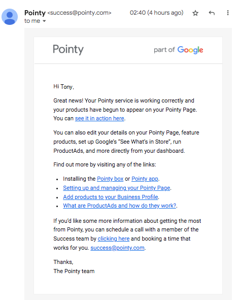 Once your Pointy Store is set up and running, you will receive an email confirmation from Google stating that your Pointy service is working correctly and your products have begun to appear on your Pointy page. A sample is pasted below for your reference.