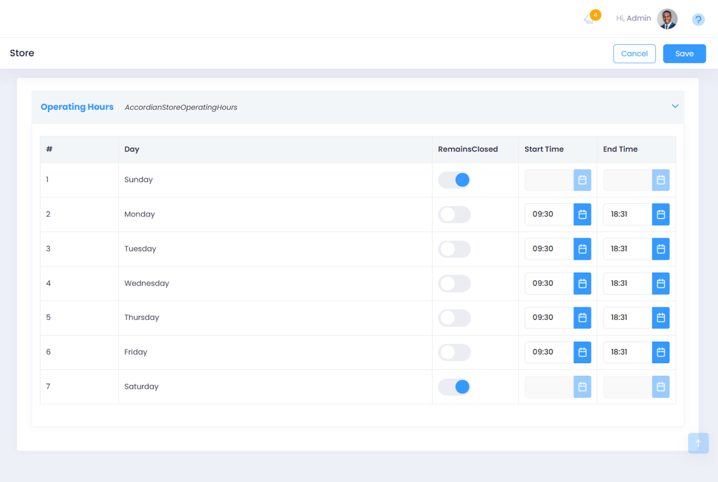 Step 5. Expand the Operating Hours accordion to specify the Store Opening and Closing time. You also need to specify the days your Store will remain closed using the flip switch.