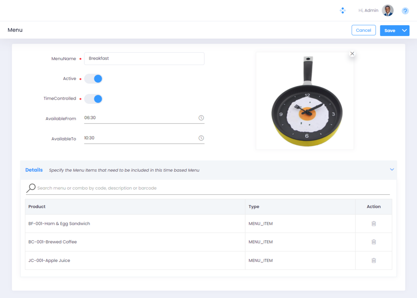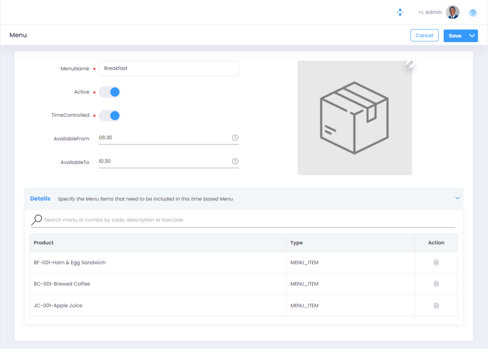 Step 5. Expand the “Details” section. Specify the Menu Items that need to be included in the Breakfast Menu. In this article we have created a simple Breakfast Menu with 3 items in total - Ham & Egg Sandwich, Brewed Coffee, and Apple Juice. This menu would appear on the Web Register. See: Time Based Menus on Web Register.