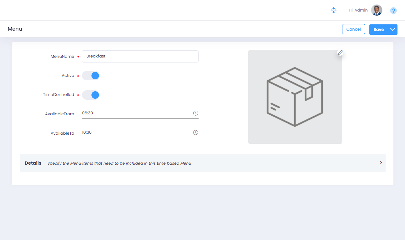 Step 4. Enable the “Time Controlled” switch. Specify the “Available From” and “Available To” time. In this article we picked up the “Available From” time as 6:30 AM and the “Available To” time as 10:30 AM, since we are setting up a Breakfast Menu
