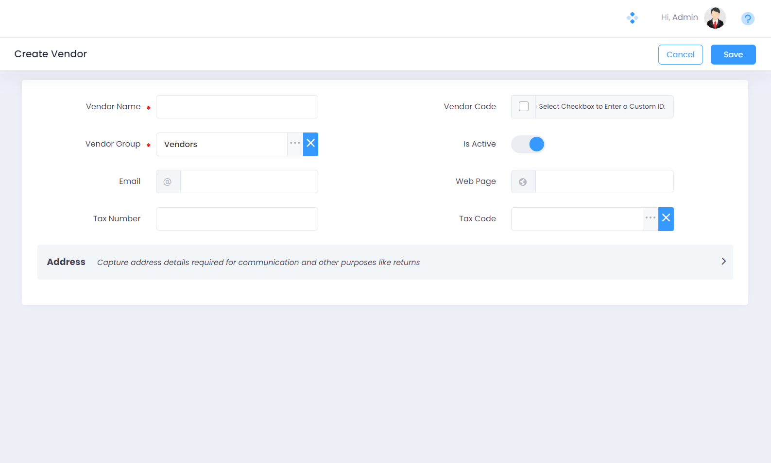 Once the required fields are filled in, you may click on the save button to save details for the vendor.