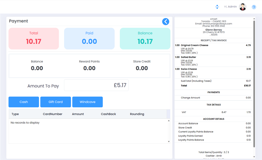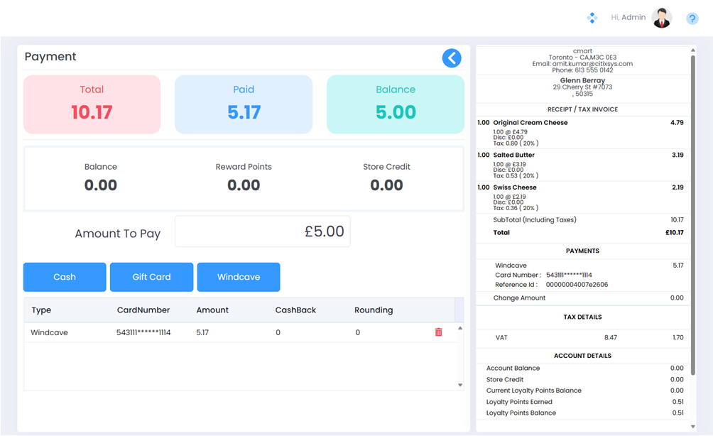 The screenshot below depicts that a payment of $5.17 was authorised using the Windcave Payment Device and the Amount To Pay field will now reflect the remaining amount to be paid.