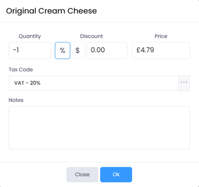 Change Quantity to -1 for all the products to be refunded. To edit the quantity of the sale product, tap on the quantity field against the product in the transaction grid. This will open up the Edit Quantity popup window. Here you can suffix the – sign to decrease the product quantity.
