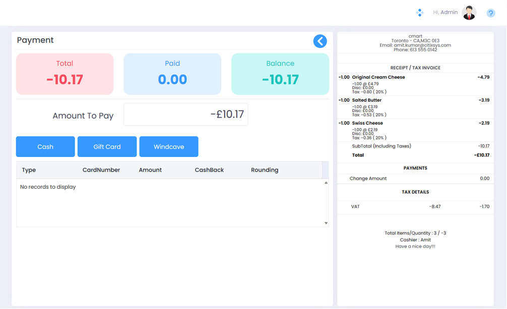 Click the Pay button on the Refund Transaction screen to reach the Payment screen