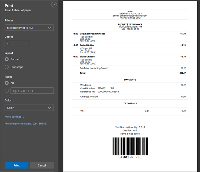 A refund sale transaction receipt is printed when the refund is successfully processed.