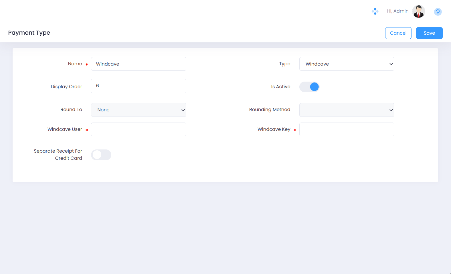 Click the Add Payment Type button and select Windcave as the payment type. Specify the name and display order and click Connect.